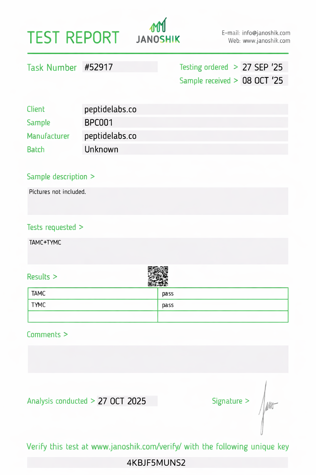 Peptide Labs products are manufactured to research-grade specifications, typically targeting ≥98% purity by HPLC unless otherwise stated. Exact purity results are documented on the corresponding batch COA.