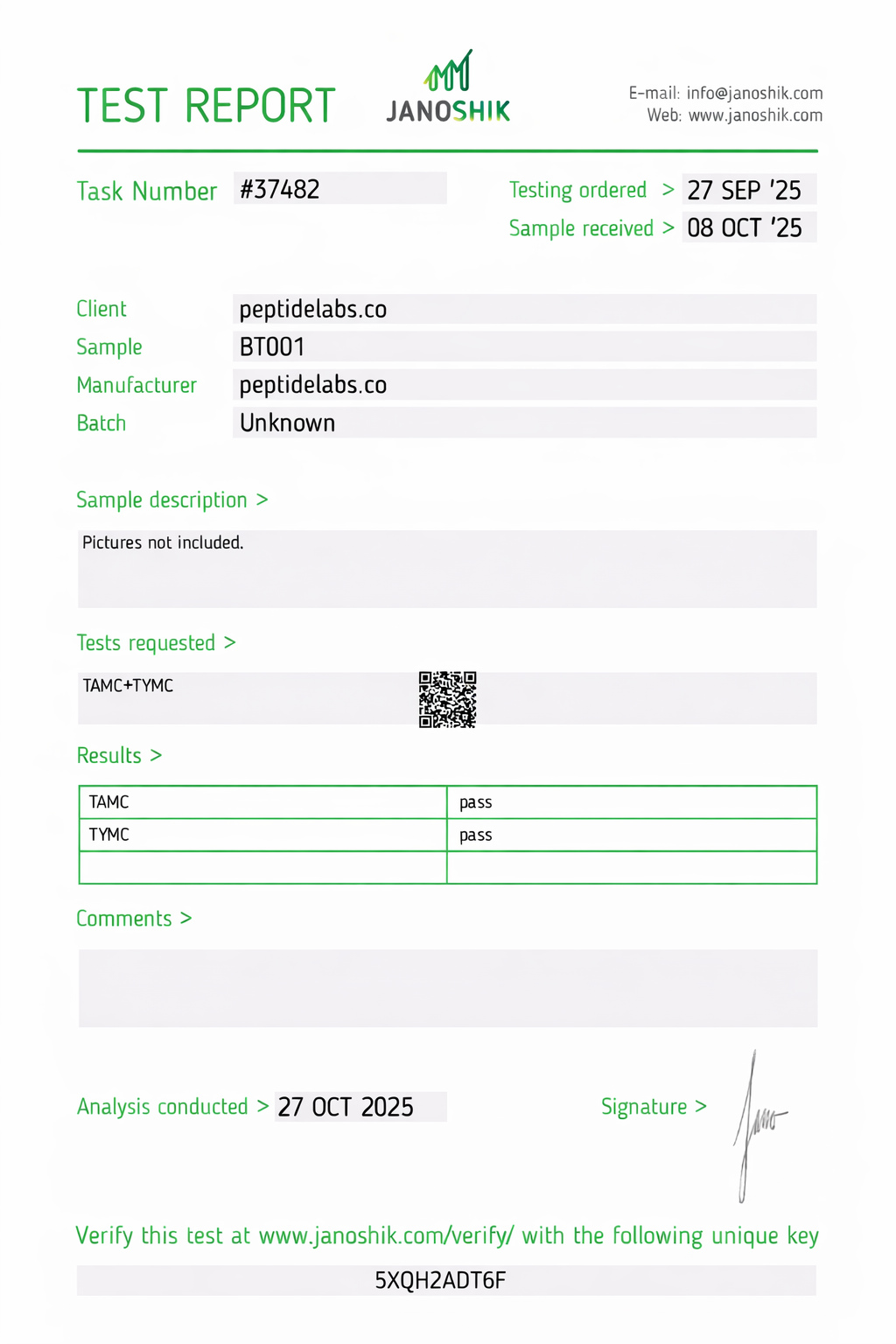 Peptide Labs products are manufactured to research-grade specifications, typically targeting ≥98% purity by HPLC unless otherwise stated. Exact purity results are documented on the corresponding batch COA.