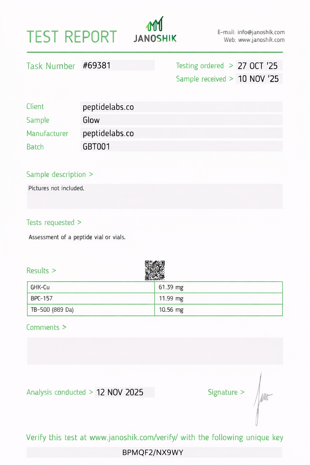 Peptide Labs products are manufactured to research-grade specifications, typically targeting ≥98% purity by HPLC unless otherwise stated. Exact purity results are documented on the corresponding batch COA.